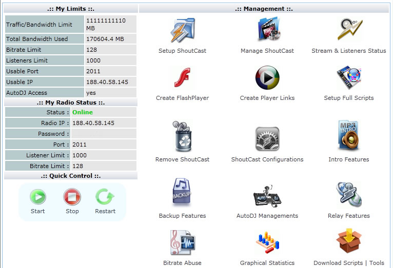 Uz svaki nalog dobijate WHMSonic ili Centova panel (Vi birate) sa kojim možete vršiti pokretanje i restartovanje streaminga, automatizovanim skriptama instalirati plejere adaptirane web browserima, koristiti AUTO DJ funkciju (uploadovanje muzike na server i automatsko puštanje pjesama tj. fajlova po plejlistama, slu?ajnim odabirom - shuffle ili sortirano prema zadanim kriterijumima, playlistama, vremenskom rasporedu, intervalu).